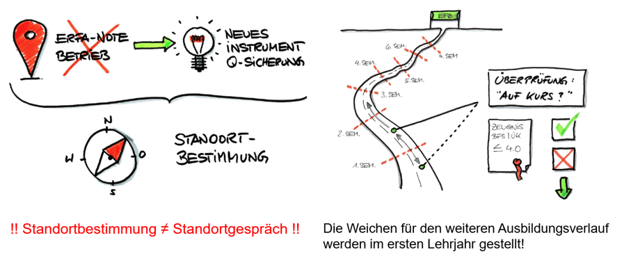 Bei allen Lernenden wird zu Beginn des 2. Semesters eine Standortbestimmung durchgeführt – unter Einbezug von Lehrbetrieb, üK-Zentrum und Berufsschule. Grundlage dafür sind die Leistungen, Noten und der Bildungsbericht des Lernenden.